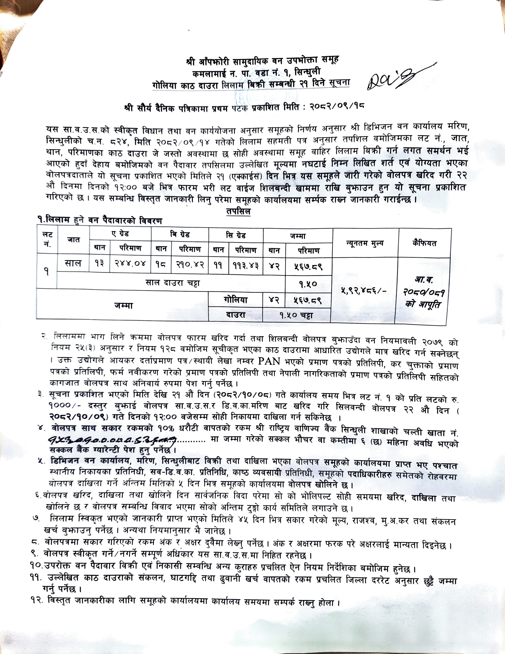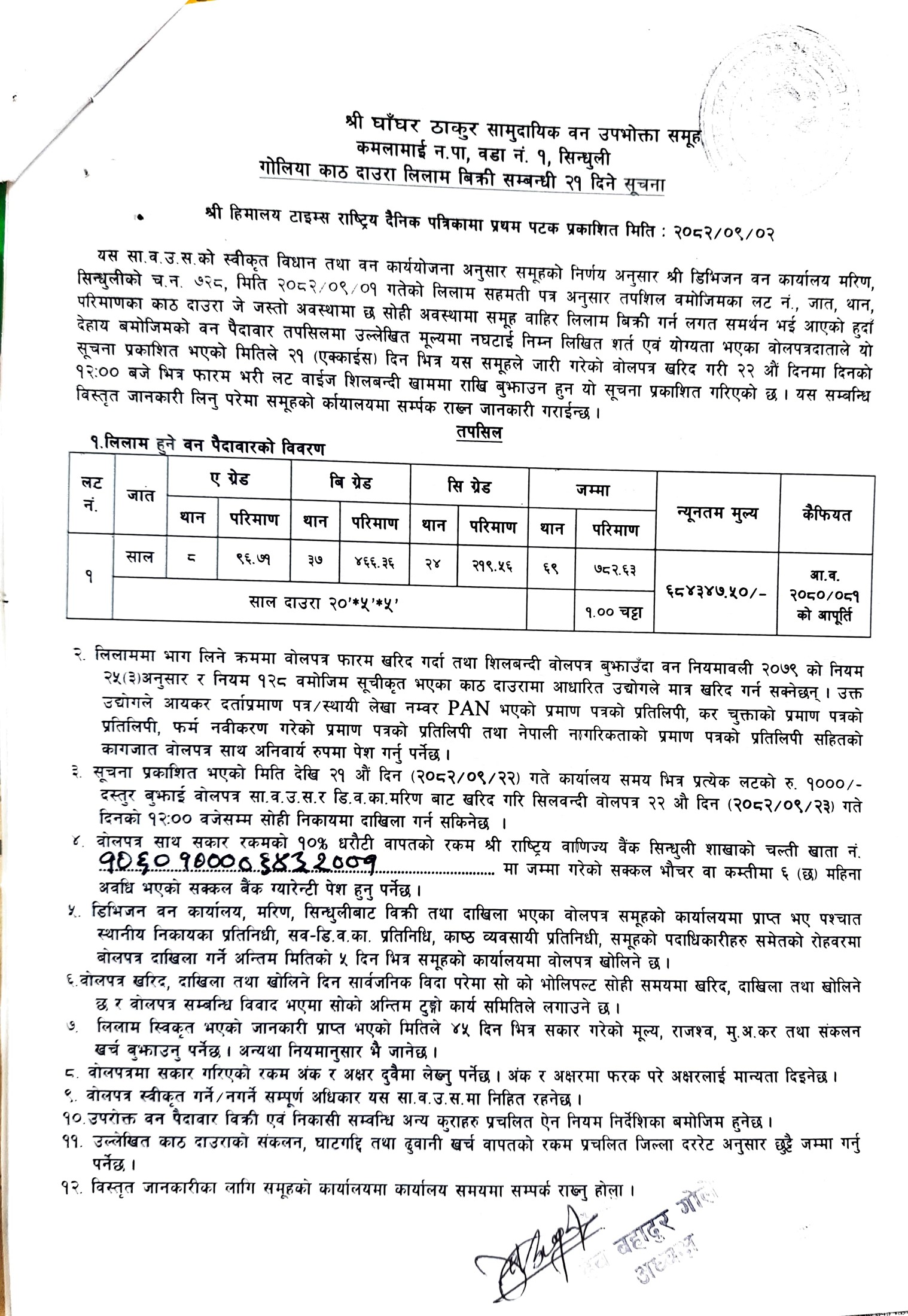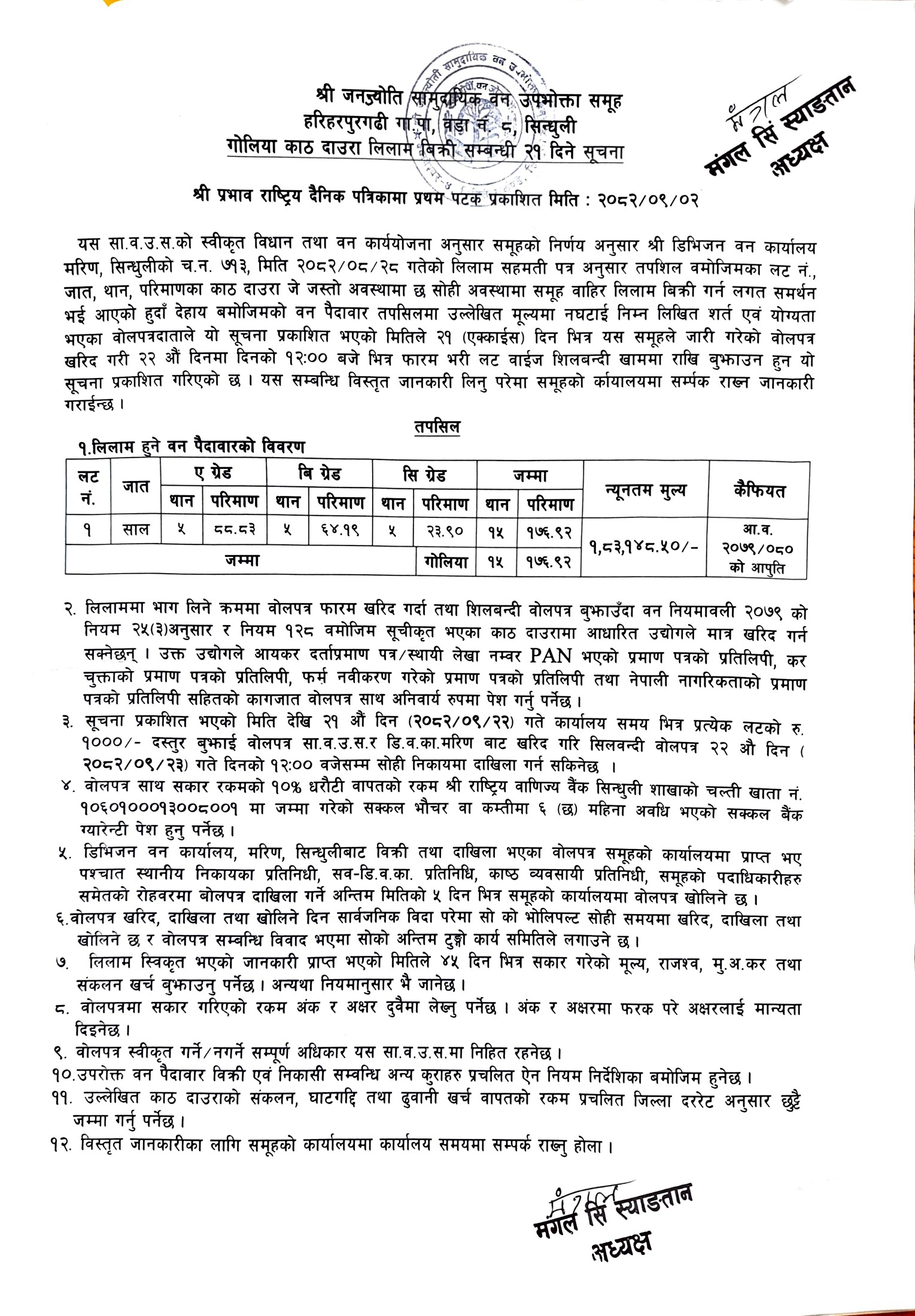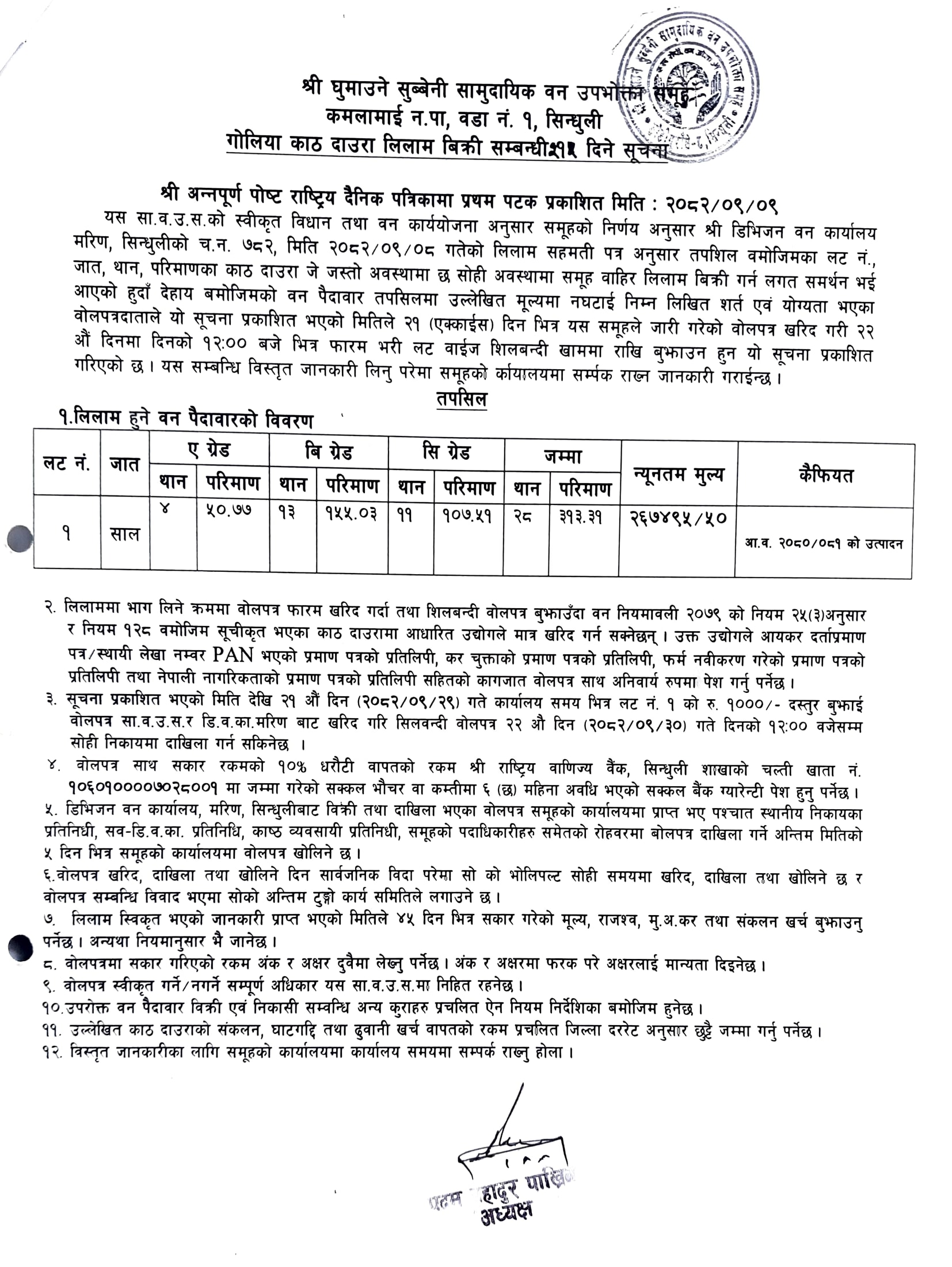 घाँघर ठाकुर सा. व. उ. स., कमलामाई १, सिन्धुलीको काठ/दाउरा लिलाम बिक्री सम्बन्धि २१ दिने सूचना