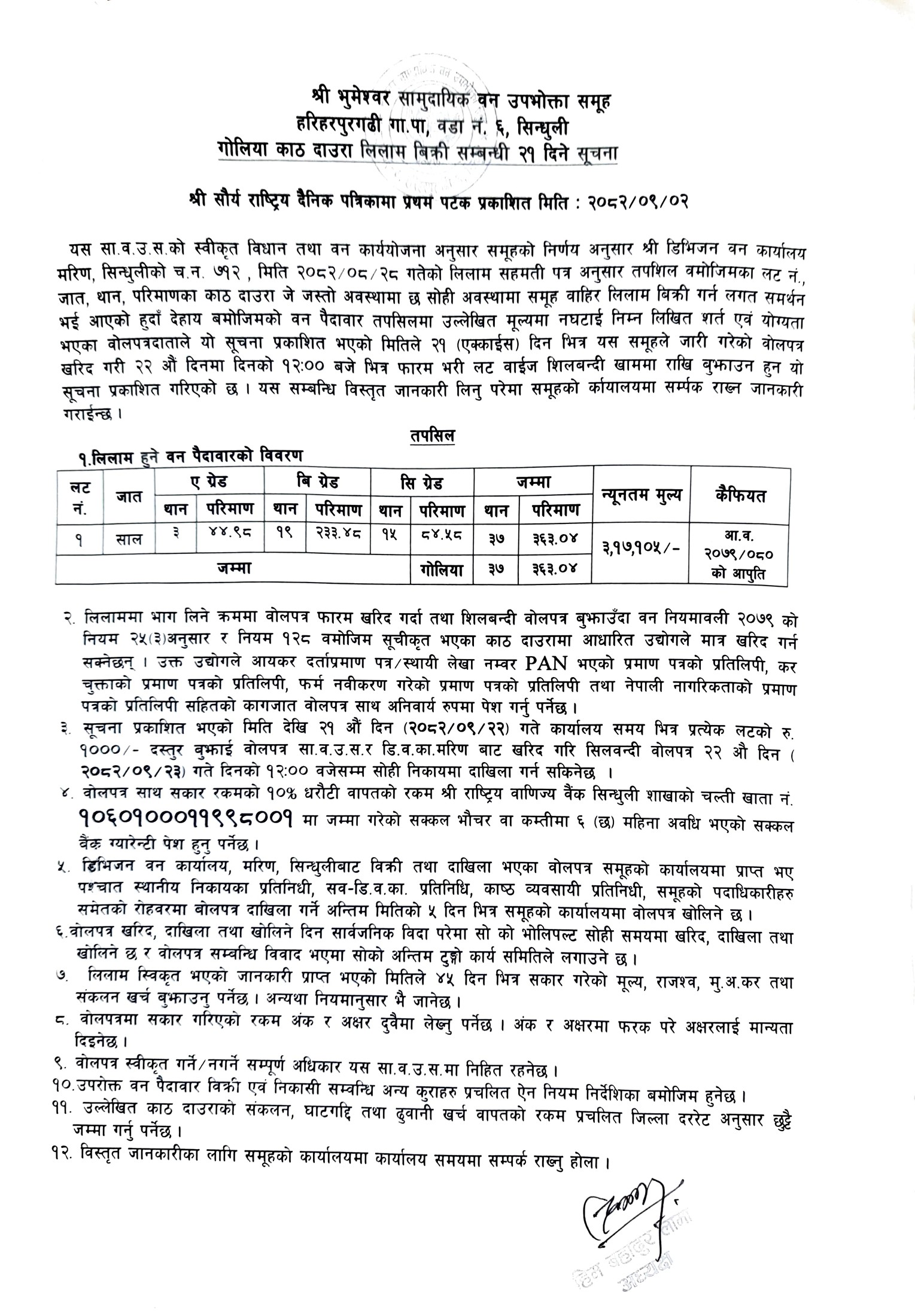 भूमेश्वर सा. व. उ. स., हरिहरपुरगढी ६ , सिन्धुलीको काठ/दाउरा लिलाम बिक्री सम्बन्धि २१ दिने सूचना