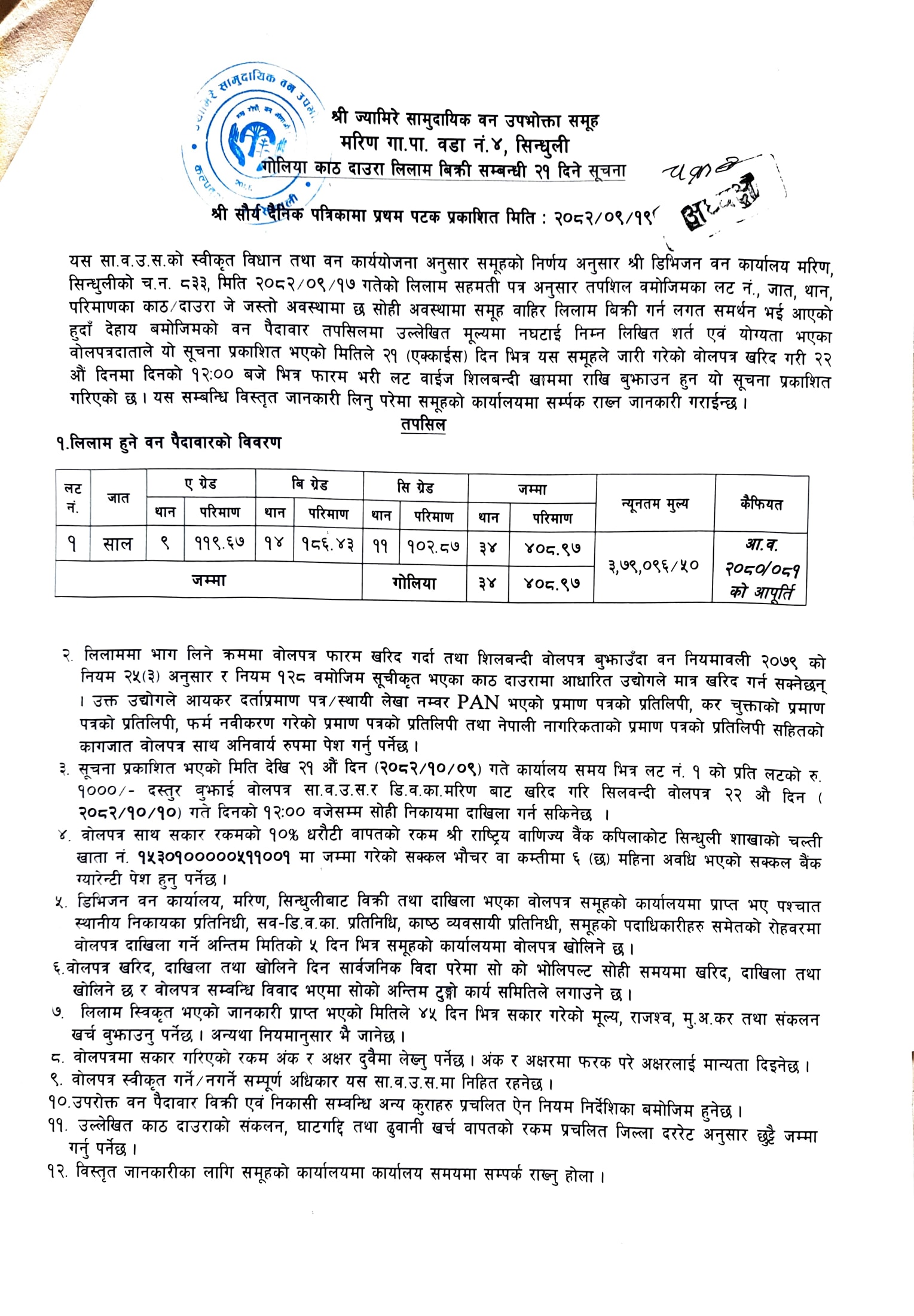 ज्यामिरे सा. व. उ. स., मरिण ४, सिन्धुलीको काठ/दाउरा लिलाम बिक्री सम्बन्धी २१ दिने सूचना