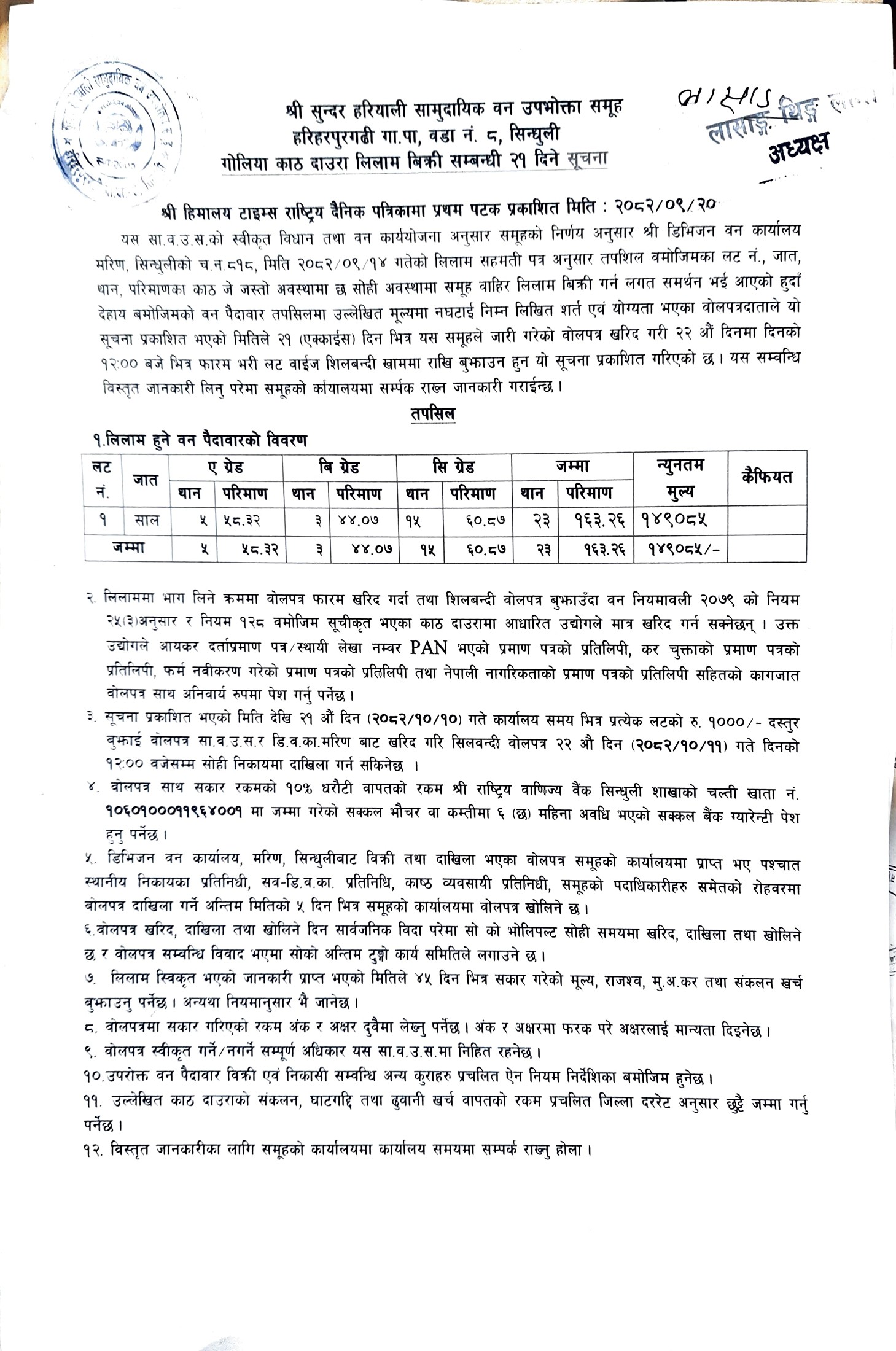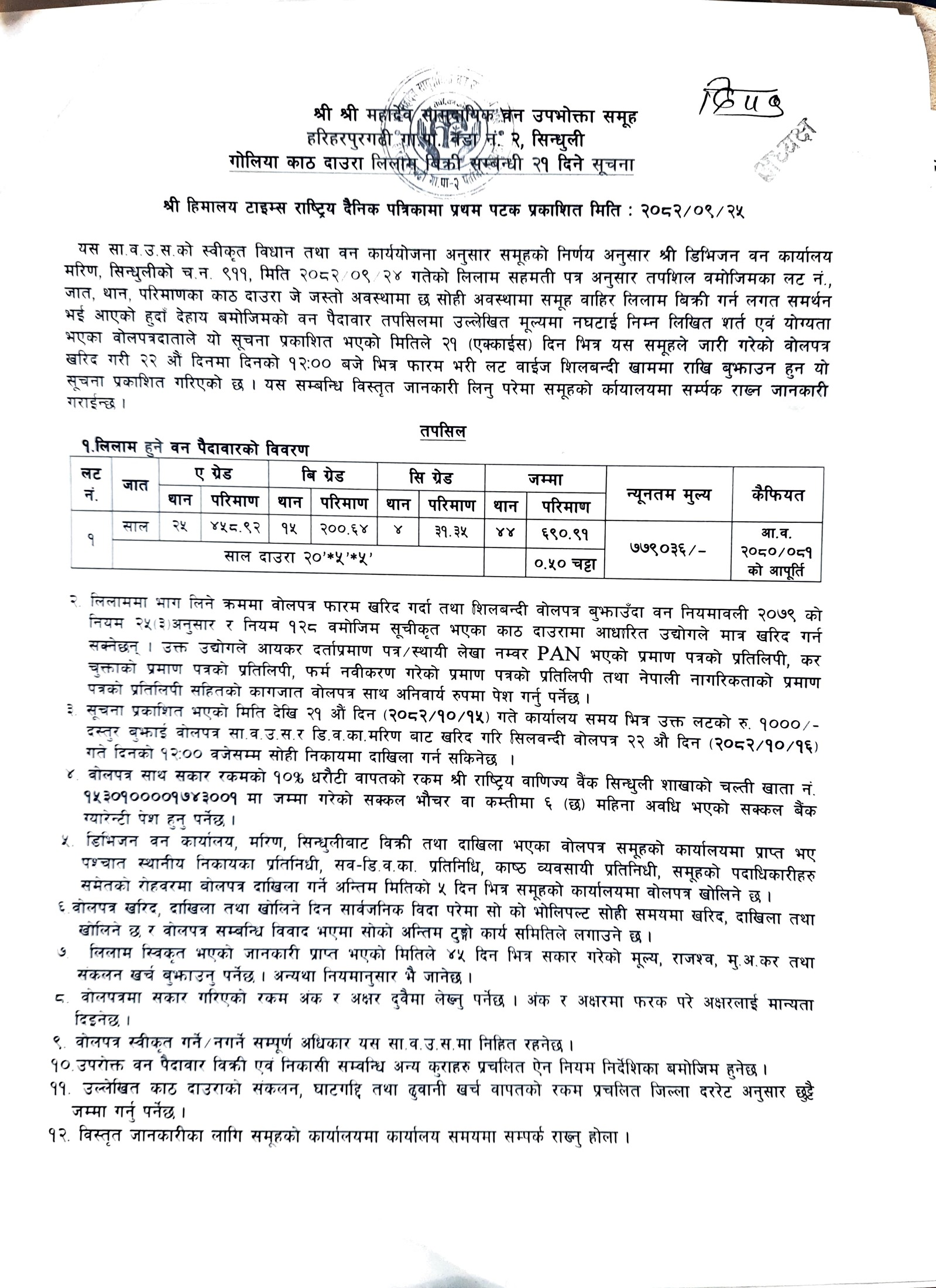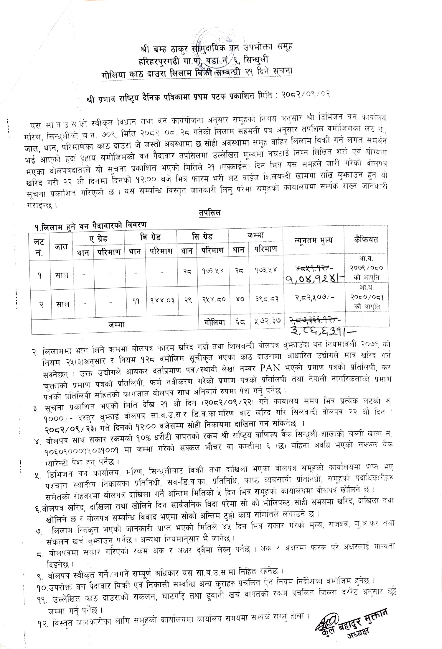 ब्रम्ह ठाकुर सा. व. उ. स., हरिहरपुरगढी ६, सिन्धुलीको काठ/दाउरा लिलाम बिक्री सम्बन्धि २१ दिने सूचना