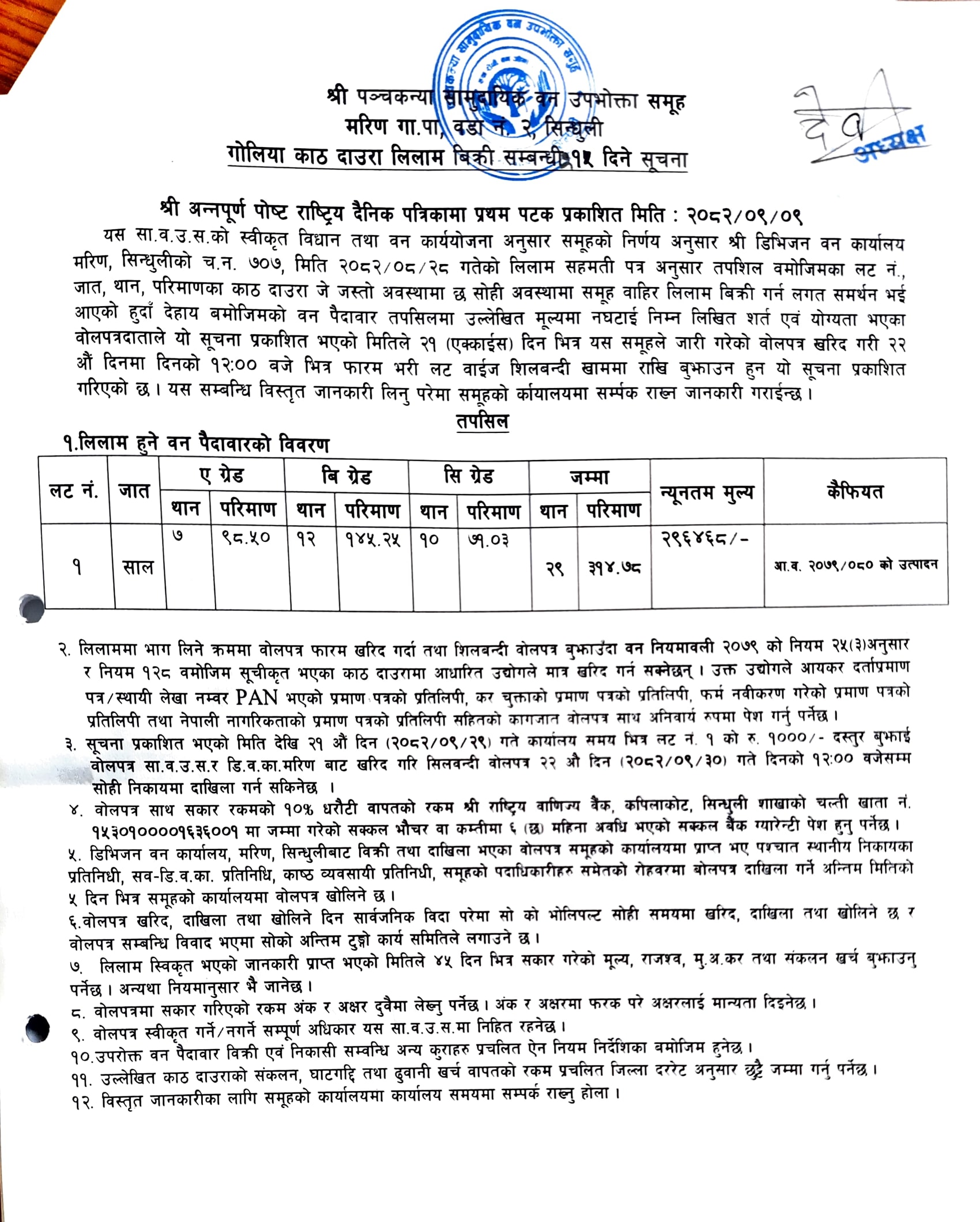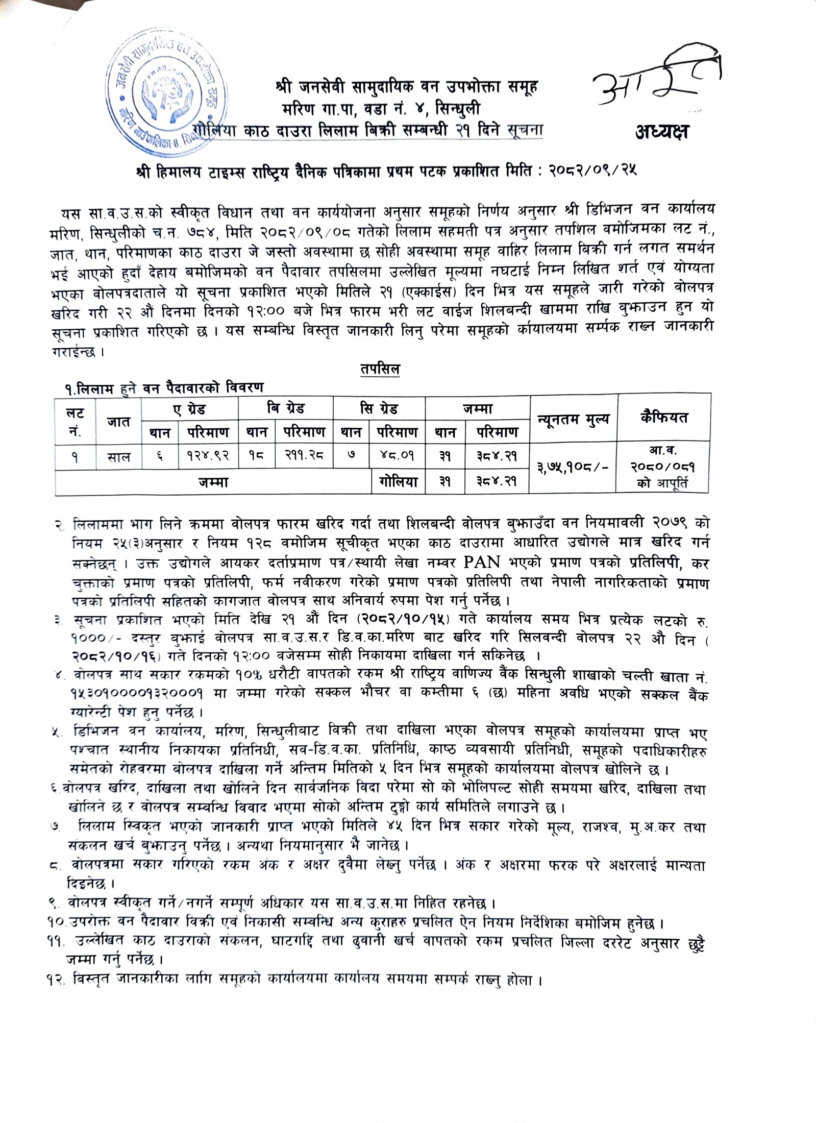 आँपझोरी सा. व. उ. स., कमलामाई १, सिन्धुलीको काठ/दाउरा लिलाम बिक्री सम्बन्धी २१ दिने सूचना