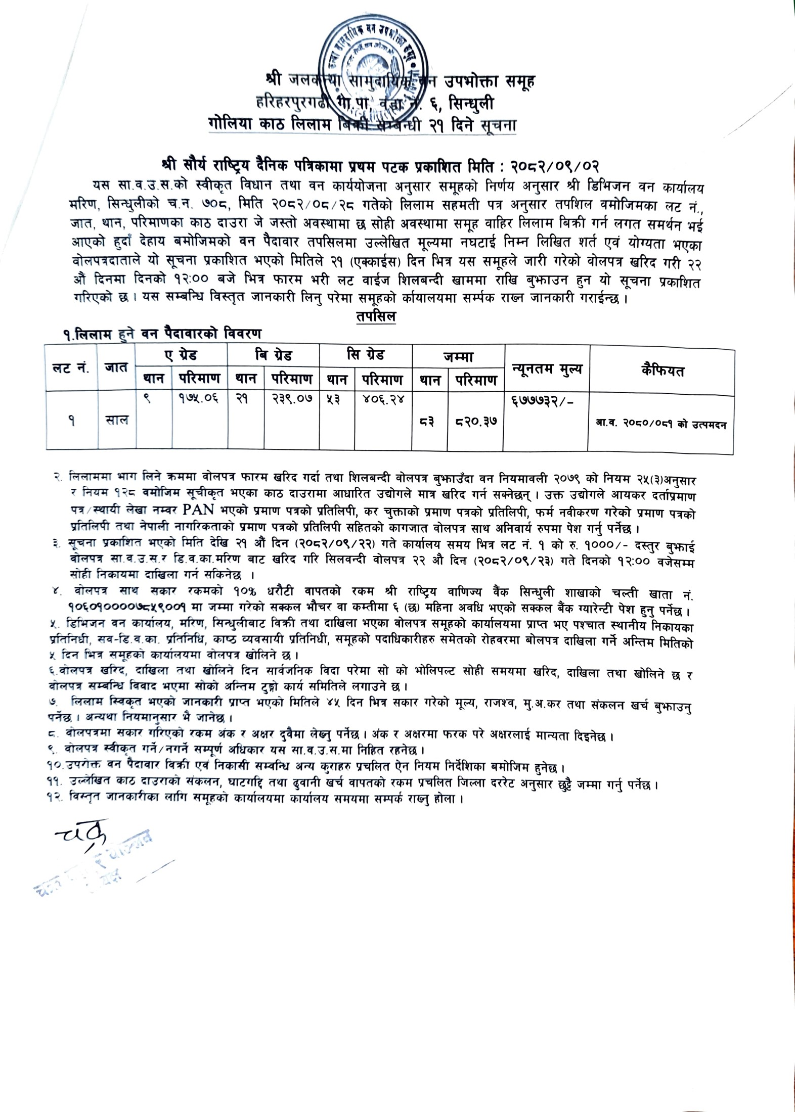 सिपाहीडाँडा सा. व. उ. स., हरिहरपुरगढी १, सिन्धुलीको काठ/दाउरा लिलाम बिक्री सम्बन्धी २१ दिने सूचना