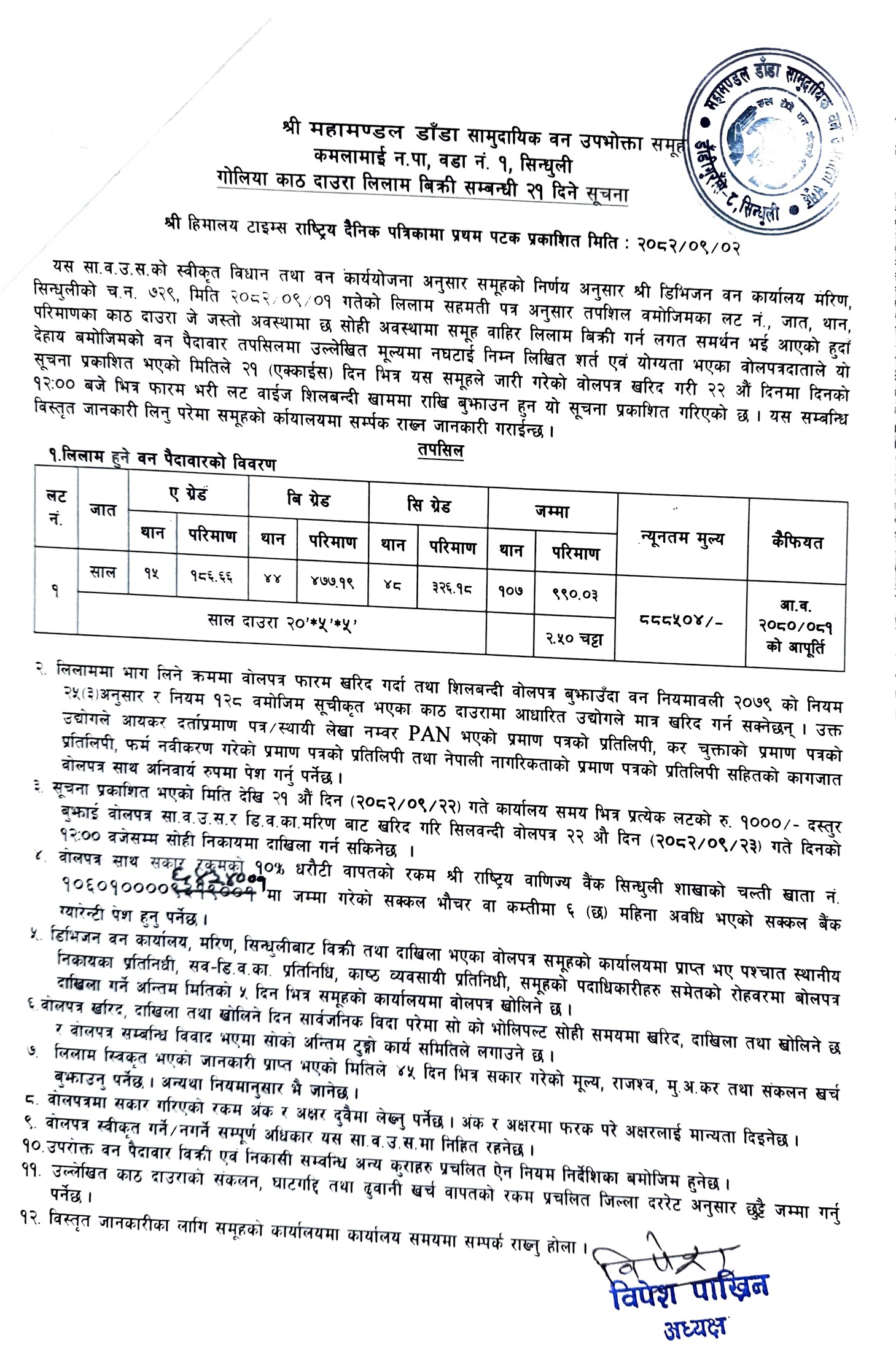 महामण्डल डाँडा सा. व. उ. स., कमलामाई १, सिन्धुलीको काठ/दाउरा लिलाम बिक्री सम्बन्धि २१ दिने सूचना