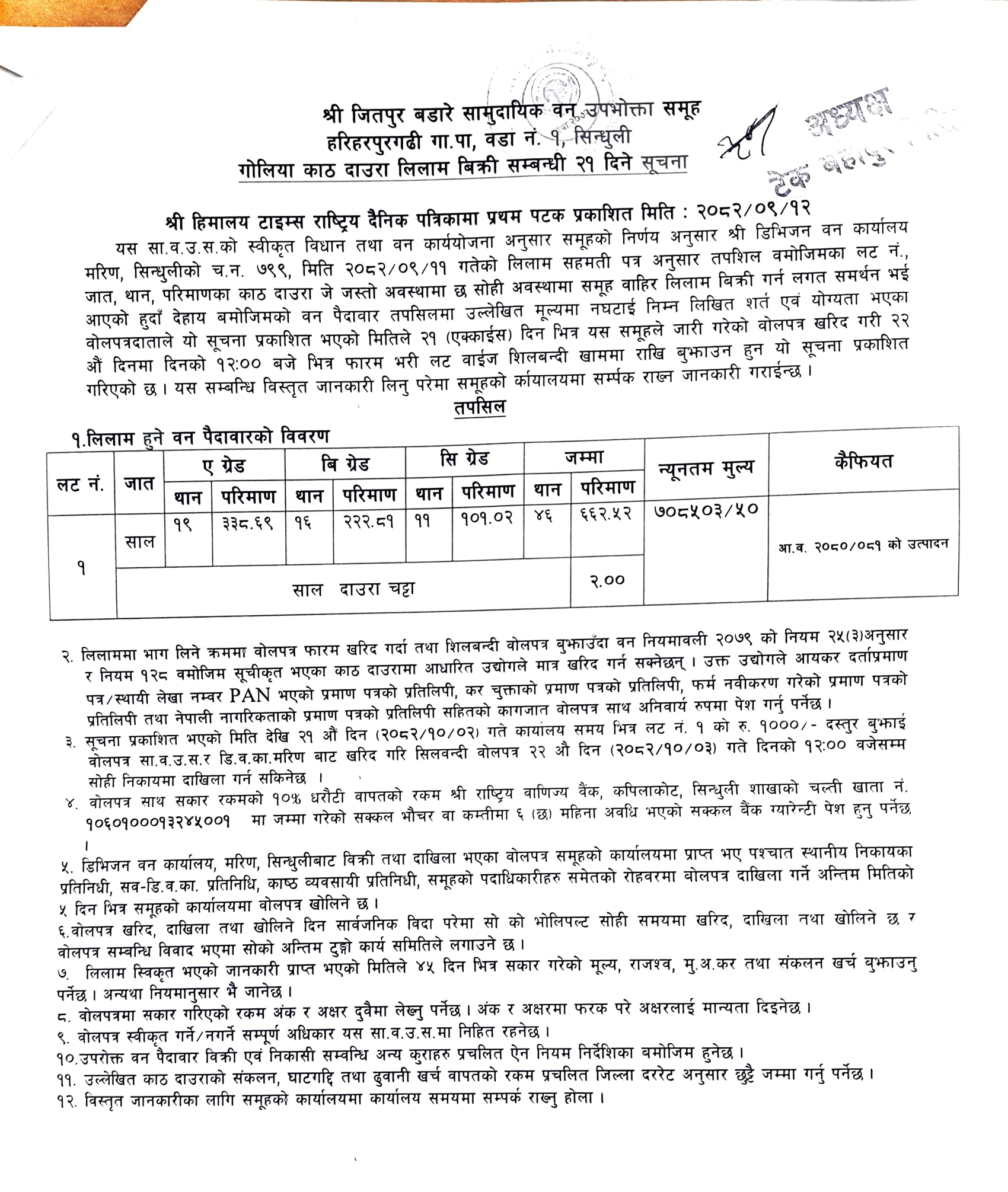 जितपुर बडारे सा. व. उ. स., हरिहरपुरगढी १, सिन्धुलीको काठ/दाउरा लिलाम बिक्री सम्बन्धि २१ दिने सूचना