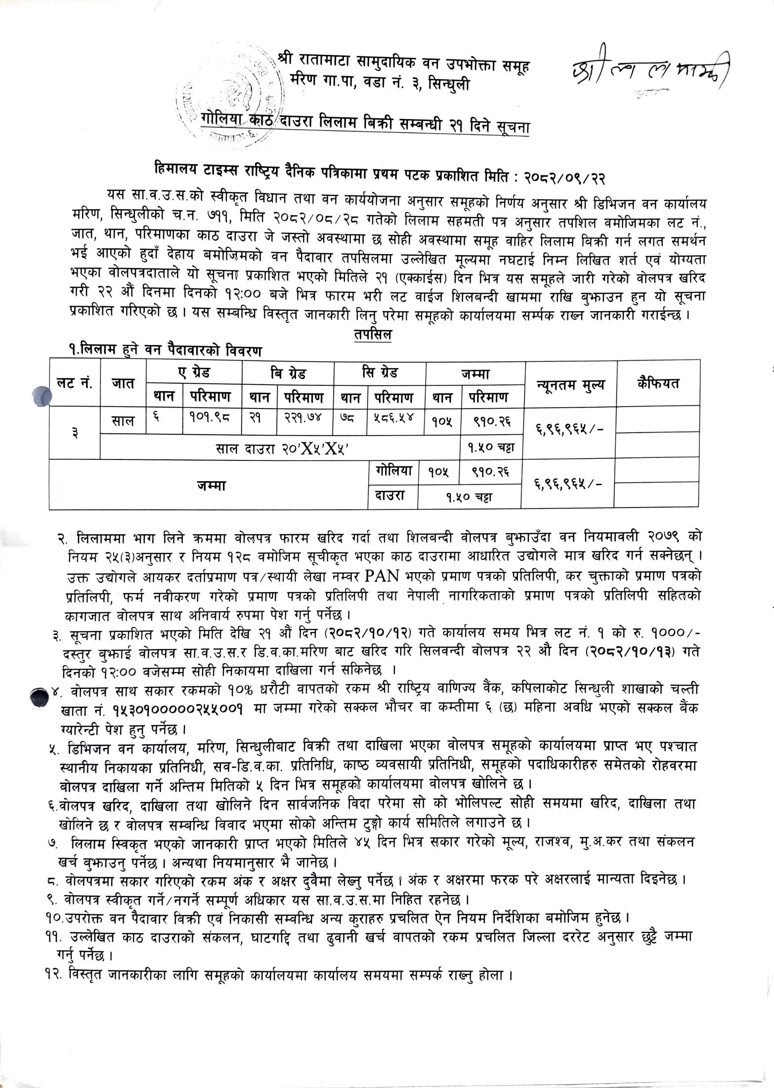 रातामाटा सा. व. उ. स., मरिण ३, सिन्धुलीको काठ/दाउरा लिलाम बिक्री सम्बन्धी २१ दिने सूचना।