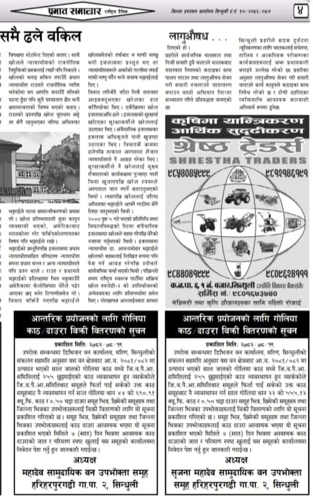 बाघभैरव सा.व.उ.स., हरिहरपुरगढी-१, सिन्धुलीको काठ/दाउरा लिलाम बिक्री सम्बन्धि १५ दिने सूचना