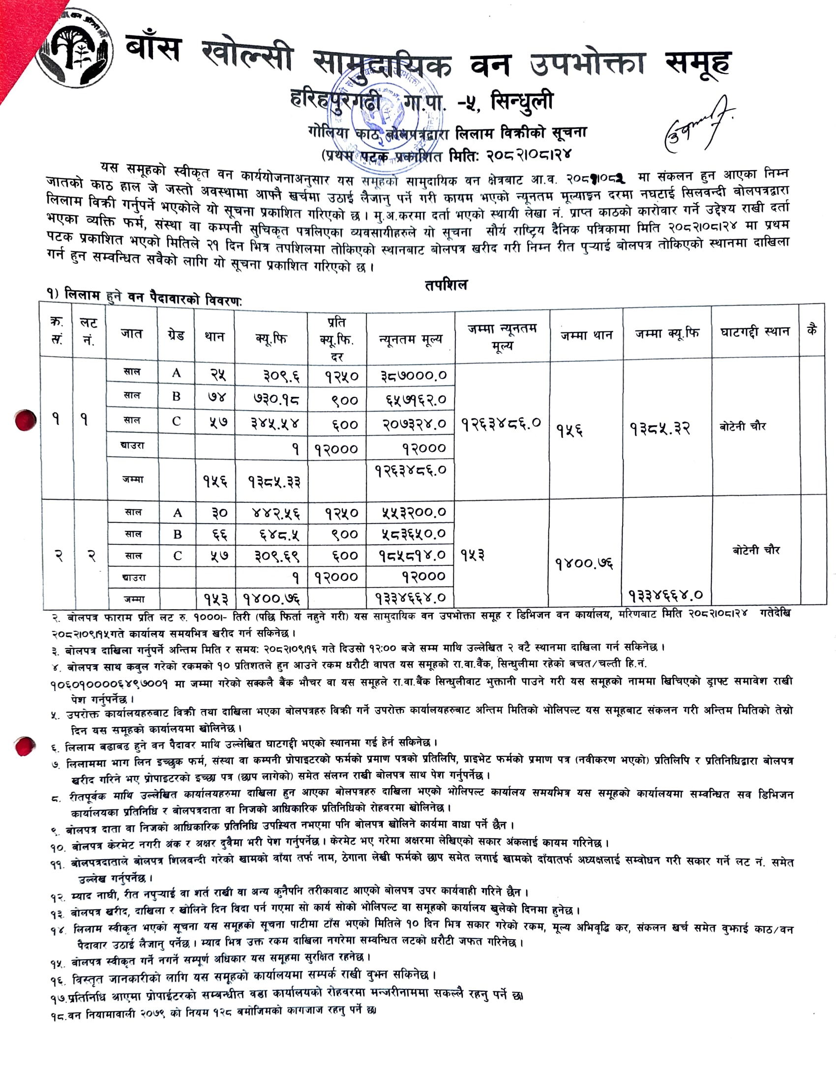 बाँसखोल्सी सा. व. उ. स., हरिहरपुरगढी ५, सिन्धुलीको काठ/दाउरा लिलाम बिक्री सम्बन्धि २१ दिने सूचना