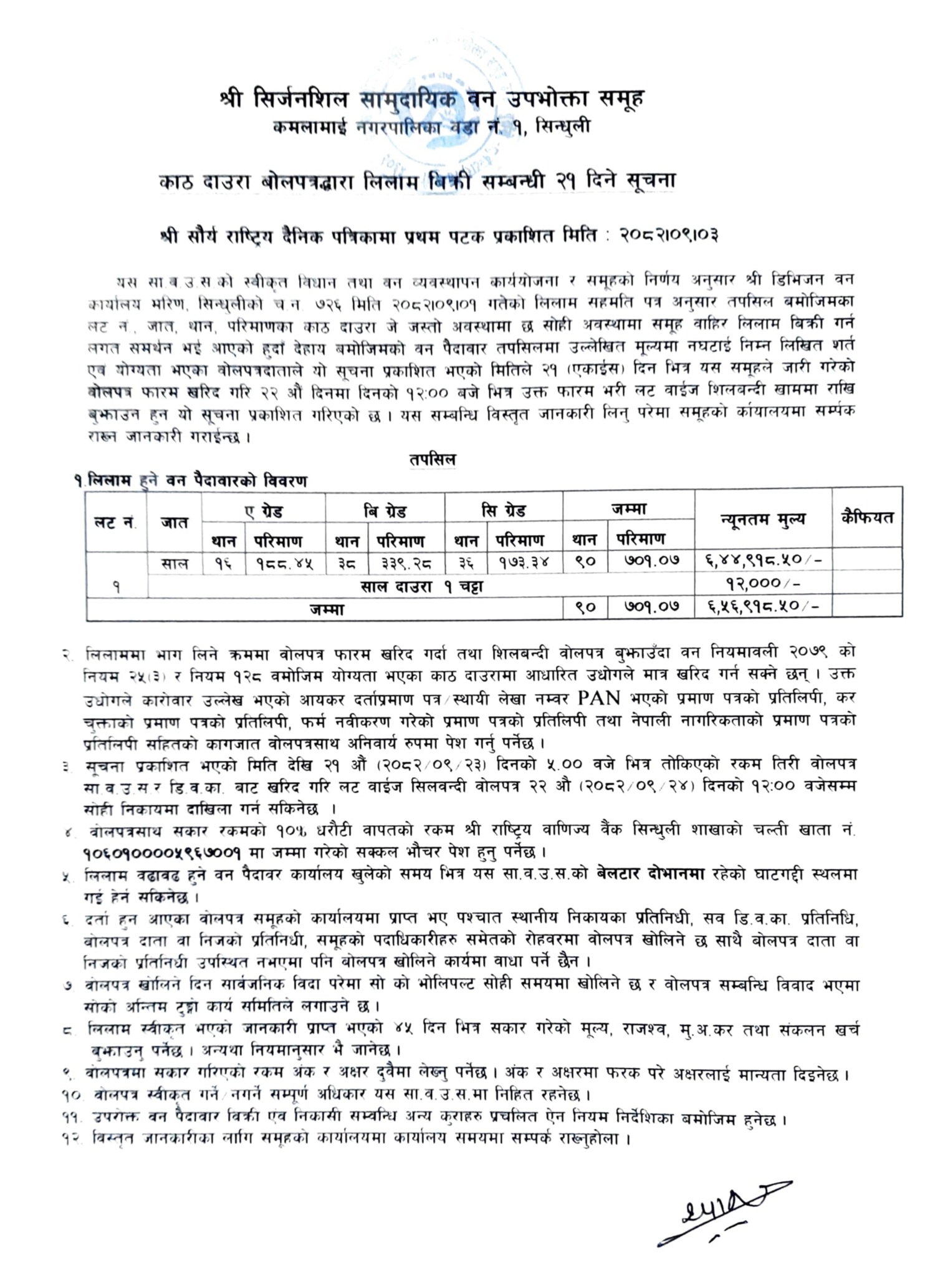 सिर्जनशील सा. व. उ. स., कमलामाई १, सिन्धुलीको काठ/दाउरा लिलाम बिक्री सम्बन्धि २१ दिने सूचना