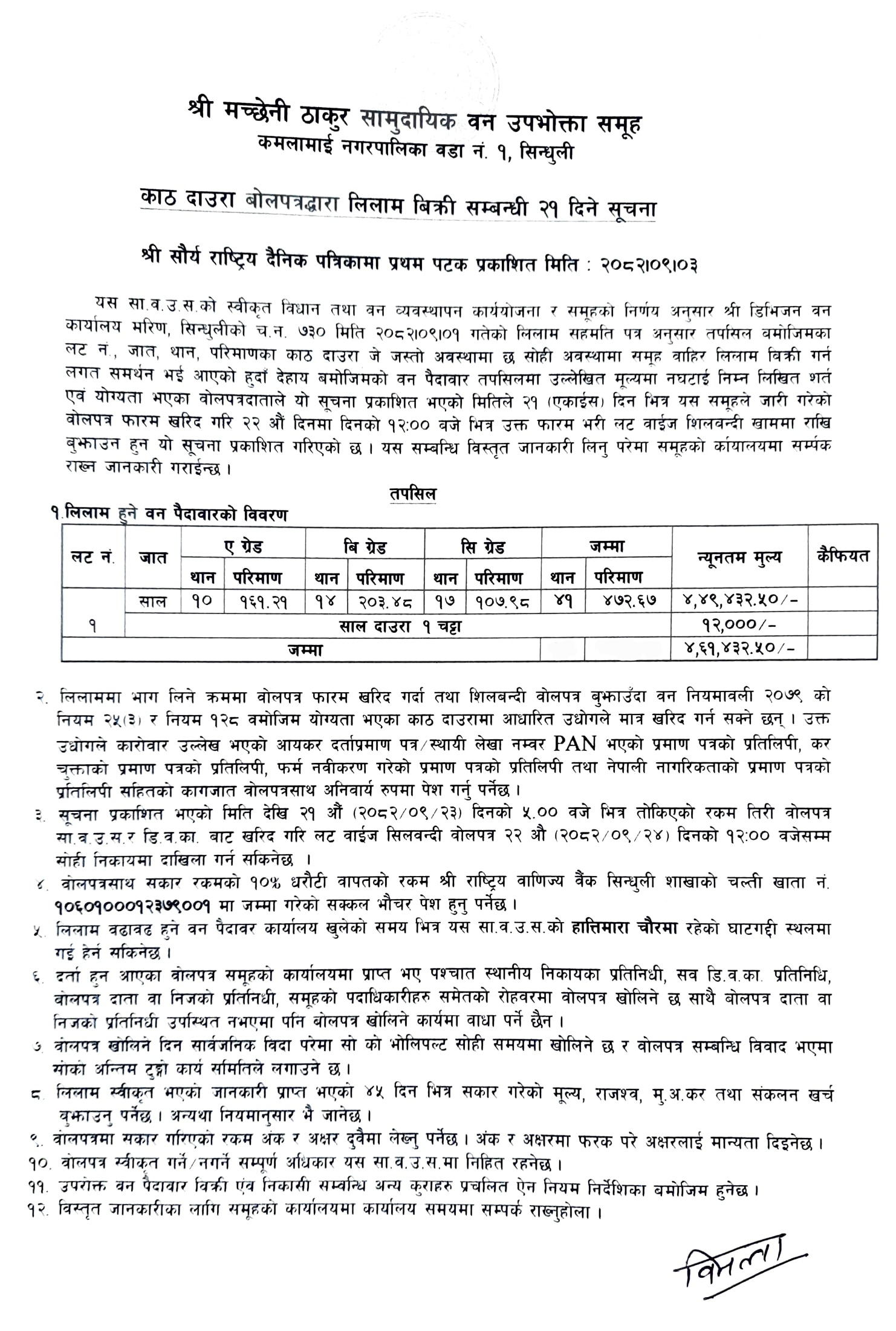 मच्छेनी ठाकुर सा. व. उ. स., कमलामाई १, सिन्धुलीको काठ/दाउरा लिलाम बिक्री सम्बन्धि २१ दिने सूचना
