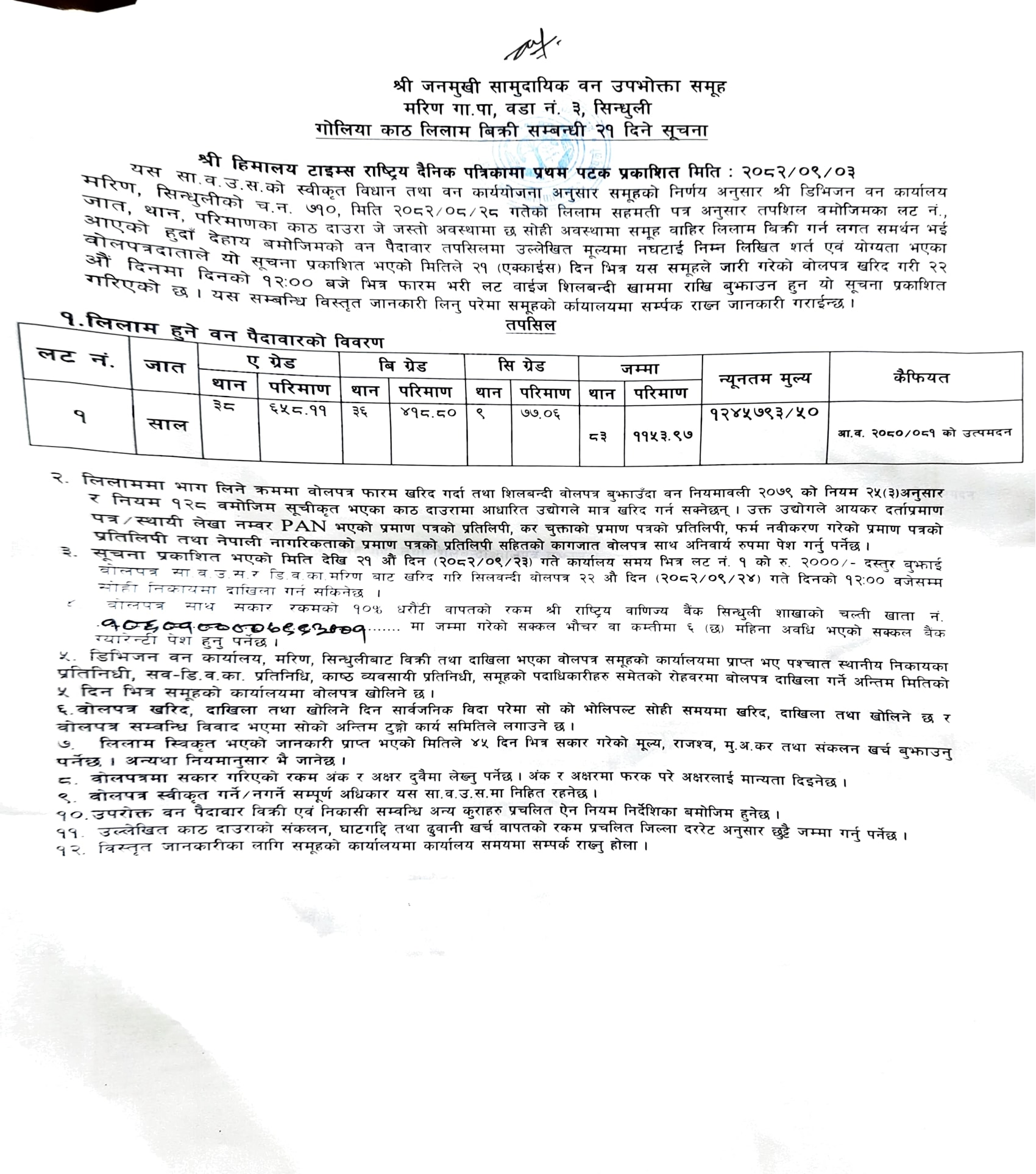 जनमुखी सा. व. उ. स., मरिण ३, सिन्धुलीको काठ/दाउरा लिलाम बिक्री सम्बन्धि २१ दिने सूचना